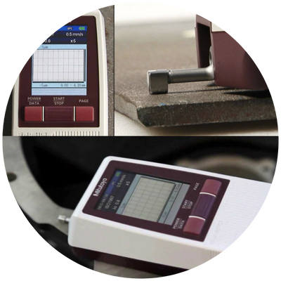 Medição de rugosidade em diversos parâmetros (Ra, Rz, Ry, Rq, etc) utilizando RUGOSIMETRO MITUTOYO modelo SJ-201.